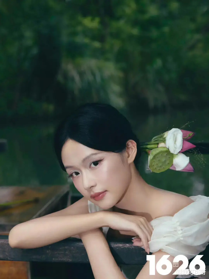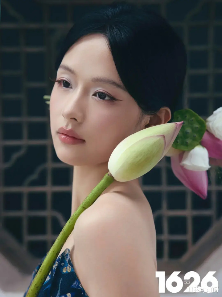 在这组造型中,余茵巧妙地以莲蓬与半开荷花为簪,将自然界的灵韵与东方美学的精髓凝聚于发间。荷花自古以来便是高洁、清雅的象征,而余茵未施粉黛的面容与花枝相映成趣,呈现出一种清新脱俗的美感。这种极致简化的装饰手法,以荷花半开半合的姿态传递出“余韵”审美,延续了中国水墨丹青的写意精神,令人感受到一种超脱于世俗的宁静与美好。