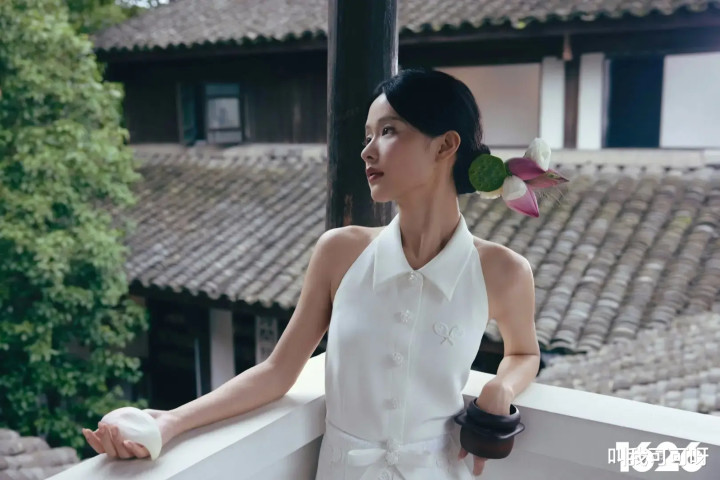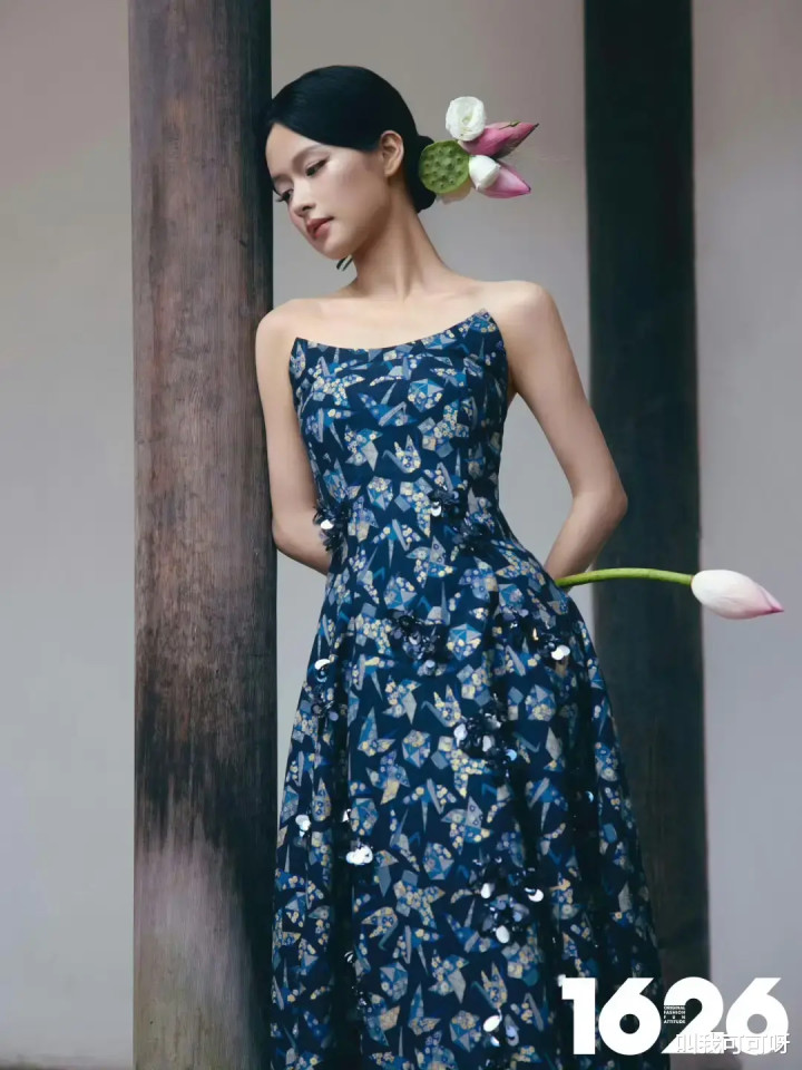 光影交错之间,发间花影与浮萍、树荫虚实交叠,仿佛重构了一个“景随人动”的诗性空间。这种独特的视觉效果,无需复刻古装造型,仅凭当代的审美语言便足以激活深藏于我们心中的文化基因。余茵挺拔如墨线的身姿、眉眼流转的灵气,将古典仕女图中的意象转化为可触摸的当代形象,瞬间触动了人们内心深处对传统文化的认同与情感投射。